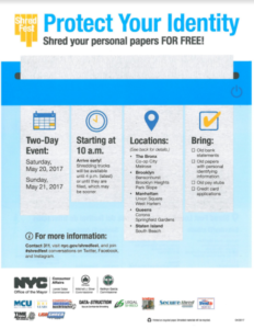 Shredfest 2017 – Protect your identity Posted on April 28, 2017 by Community Board 11 Shred your personal papers for free! Two day event starting Saturday, May 20, 2017 10am. For more information, click here or here. Share this article on...